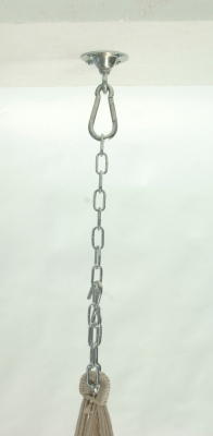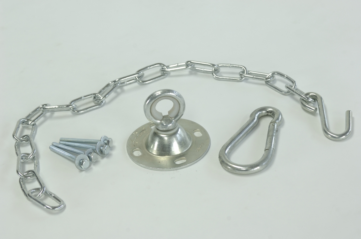 Ένα κρεμαστό κάθισμα πρέπει να γυρνάει ελεύθερο προς όλες τις κατευθύνσεις και για την ευχαρίστηση αλλά και για να μην μπερδεύονται μεταξύ τους τα σχοινιά και τρίβονται. Έτσι κατασκευάσαμε μια περιστρεφόμενη βάση για ταβάνι με αλυσίδα για την ρύθμιση του ύψους του καθίσματος. Βίδες και μεταλλικά βύσματα συμπεριλαμβάνονται εντός της συσκευασίας.